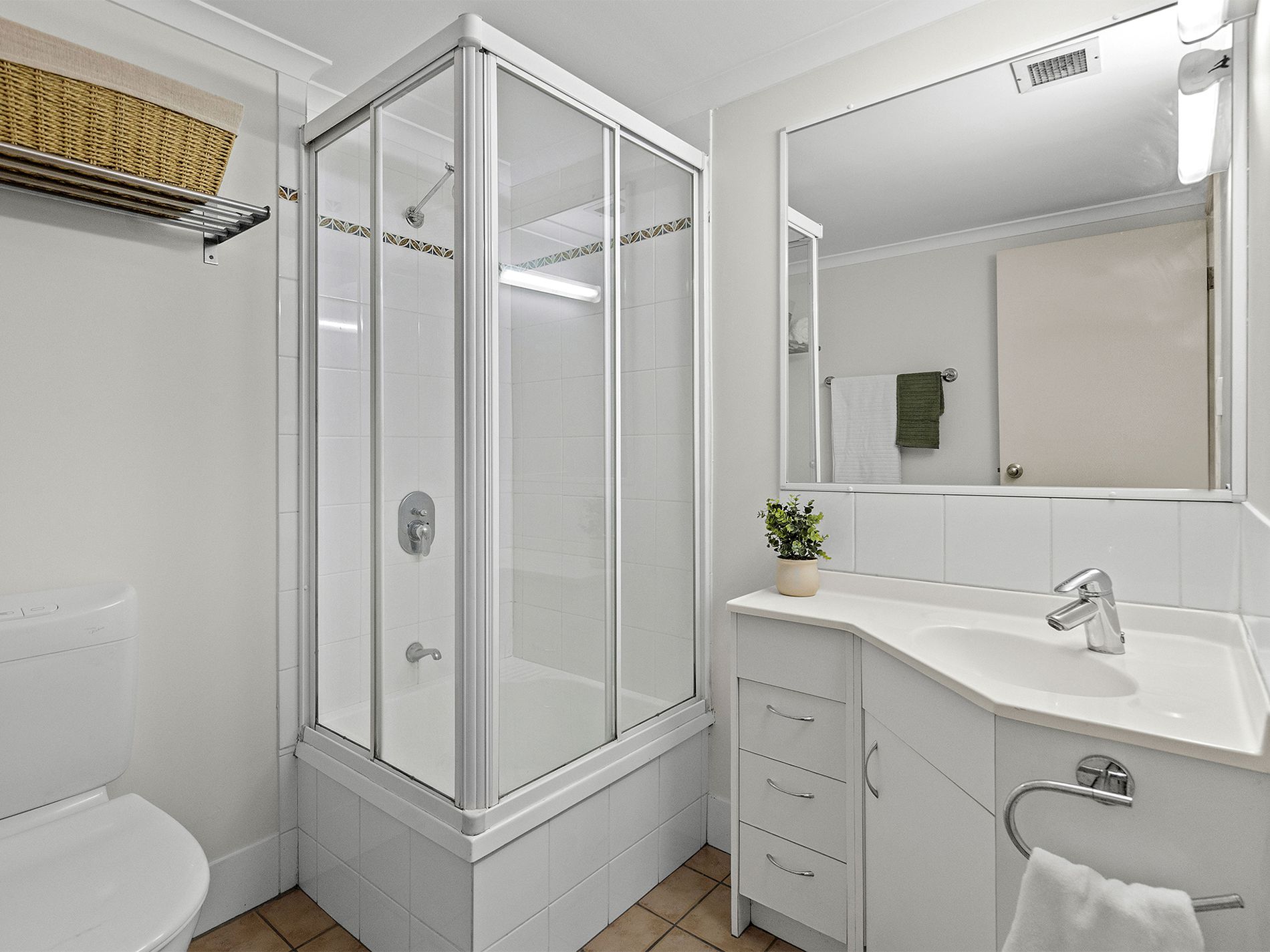 - Additional family bathroom with cubicle shower and corner-inset vanity.